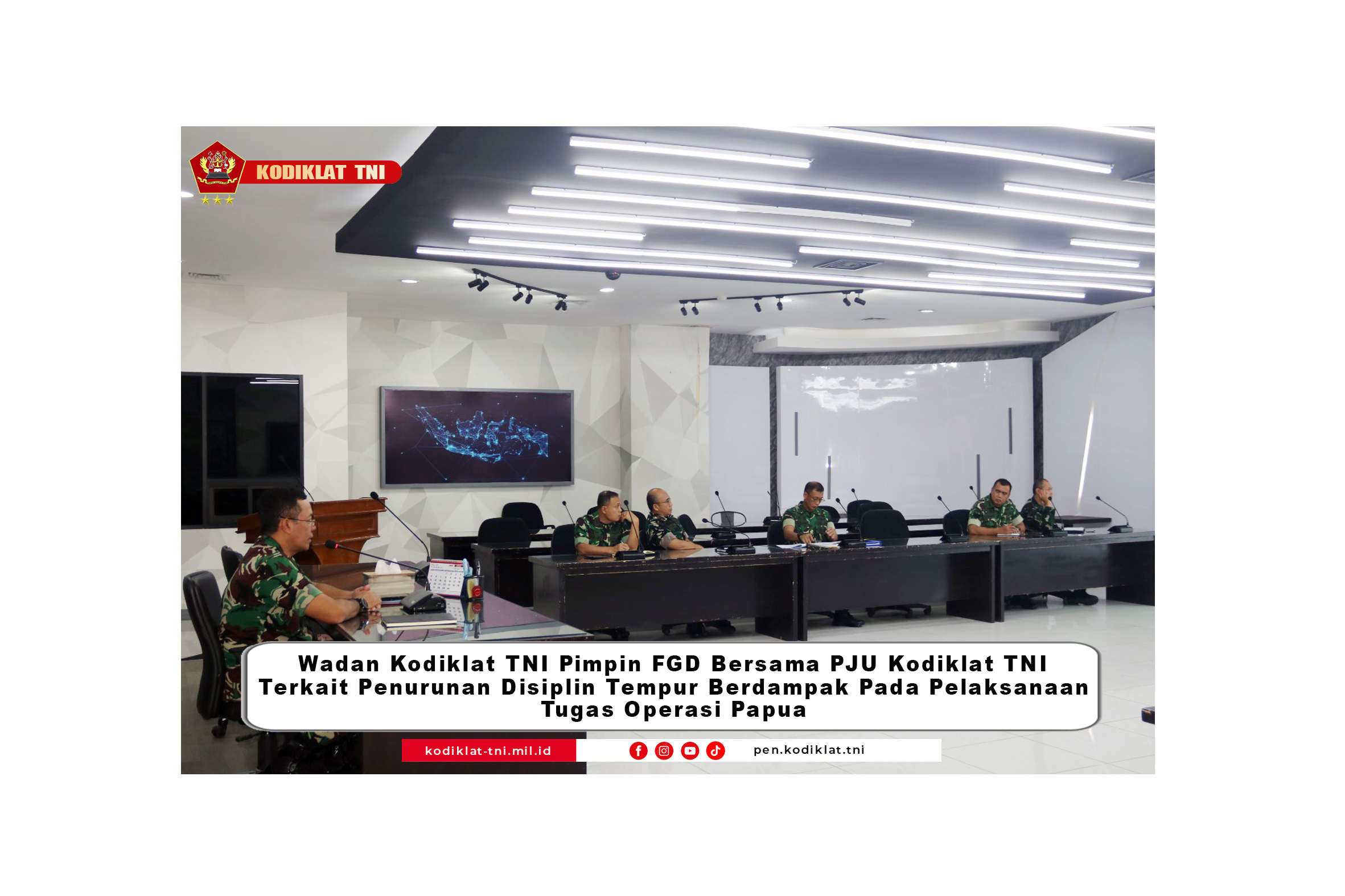 berita informasi(Serpong), Wadan Kodiklat TNI Marsda TNI Bambang Gunarto, S.T., M.M., M.Sc. pimpin FGD bersama seluruh PJU Kodiklat TNI dg Tema diskusi penurunan disiplin tempur berdampak pada pelaksanaan tugas opersi Papua di ruang rapat Kodiklat TNI Serpong Tangerang Selatan, Kamis (2/4/2026).