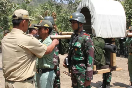(Pen Kodiklat TNI), Camat Kretek bapak Widada, S.Sos., M.H. pimpin acara penyerahan tandu duplikat Jenderal besar Sudirman dalam rangka kegiatan Napak Tilas Rute Panglima Sudirman Sepa PK TNI TA 2023 Susgakes di Parangkritis Desa Grogol Kabupaten Bantul Yogyakarta, yang dihadiri Danse Pa PK TNI, Asopsdik Pusdikma Kodiklat TNI, Wadanse Pa PK TNI, Dansatdik Sepa PK TNI Susgakes dan Kepala Desa Parangkritis.